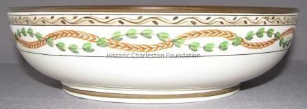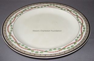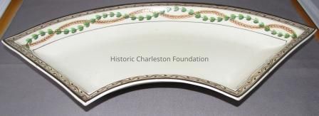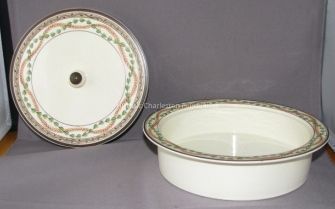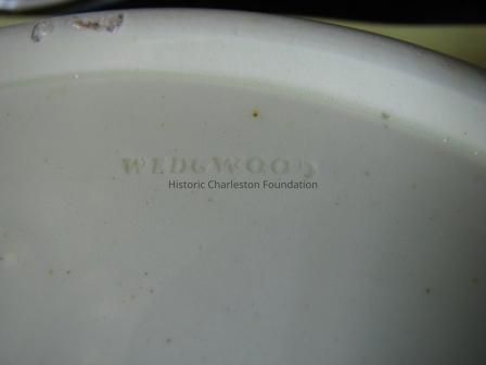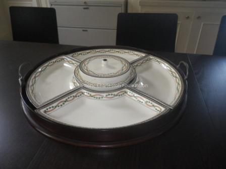 Wedgwood supper set in the "creamware" style. Made of hard-paste porcelain; tray (mahogany) with brass handles. Ten supper plates, four serving dishes, and a central circular bowl with inset bowl and lid.Collection