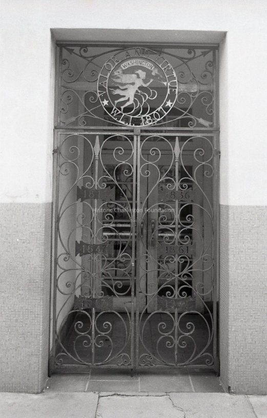 Decorative ironwork door, the side entry to 238-242 King Street. Ironwork features circular Washington Light Infantry emblem "Valor and Virtue - Washington - W.L.I. 1807," with six small iron panels with the years 1812, 1836, 1847, 1861, 1917, and [1941?].Collection