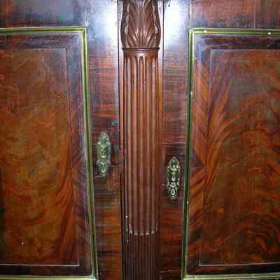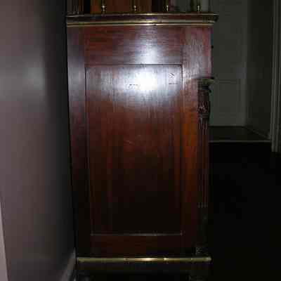 Sideboard made of mahogany with mahogany veneer. High rail at back of piece with brass trim and side rail. Three drawers over three sets of doors. Drawers have brass lion head pulls. Ownership in the Vanderhorst familyCollection