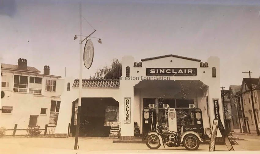 Scan of an original photograph of the Sinclair Filling Station that was located at 158 Tradd Street at the corner where New Street meets Tradd. If identification is correct, this photo features the south elevation on Tradd. Motorcycle parked in the foreground. Nearby houses also visible at left and right.Collection
