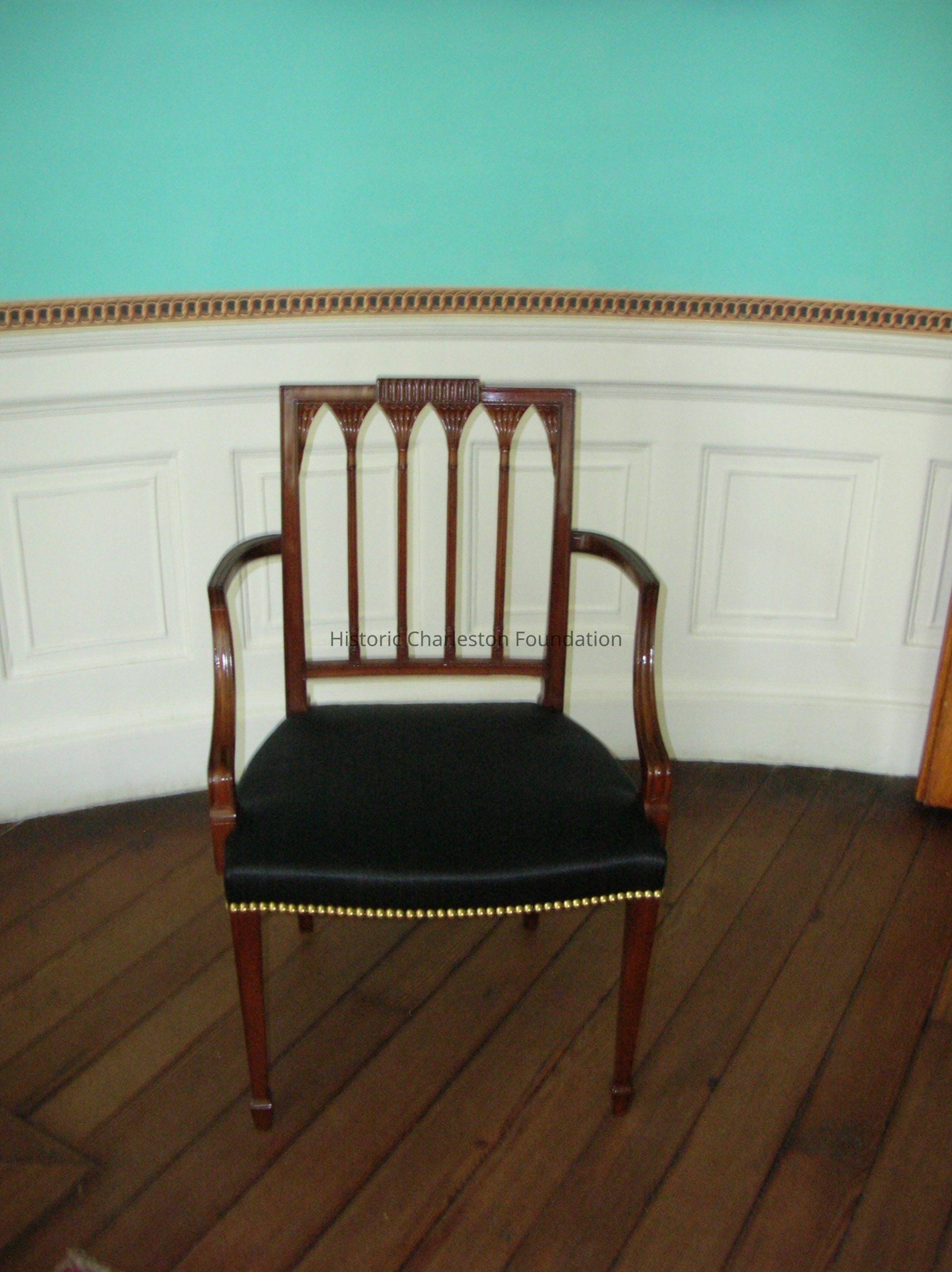 Made of mahogany, with yellow pine corner braces and an ash seat, this Neoclassical armchair is one of a set of twelve or more dining chairs, six of which are in the MESDA collection. A similar chair is described in 'The New York Book of Prices for Cabinet and Chair Work" for 1802: Square Back Chair. No.III With four gothic arches, and four turned columns, sweep stay, and top rail, with a brake in ditto; plain taper'd legs." Several New York examples in various collections have been attributed to the shop of partners Abraham Slover and Jacob Taylor, who worked in New York City from 1802 to 1805. This armchair resembles these New York products, but it lacks their four corner rosettes and its upper panerl is carved wiht thirteen flutes rather than the sunbursts and swags popular in the North. These chairs are also shorter than their New York counterparts.General Notes