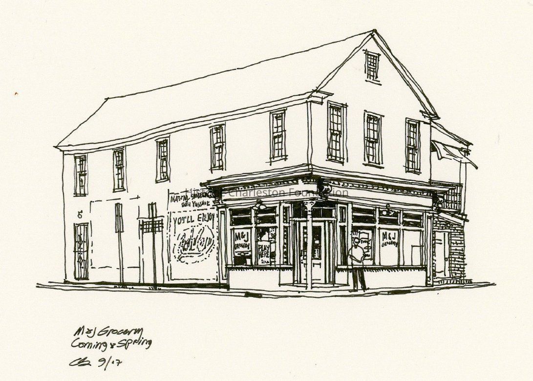 b: "M&J Grocery, corner of Coming and Spring Streets," ink on paper. (224 Coming Street.)