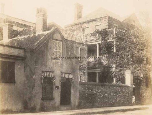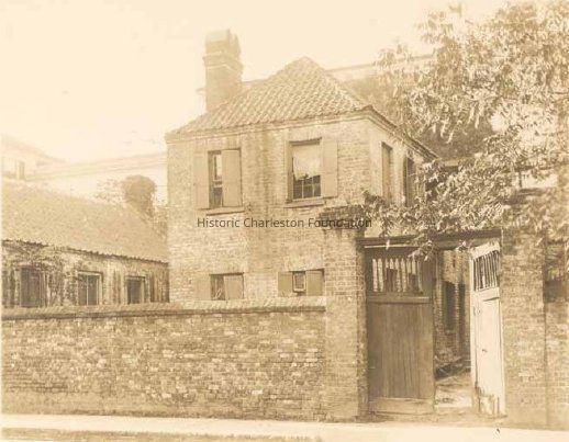 a: Two-story brick dwelling, possibly an outbuilding to neighboring house. Brick wall and gate in foreground. (Identified as "slave quarters" in GWJ collection in the Lowcountry Digital Library.)