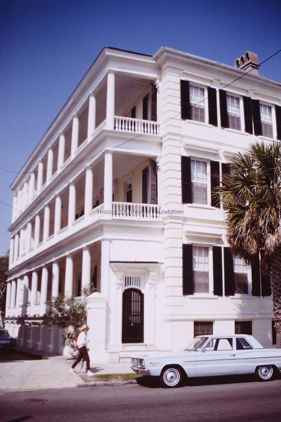 Color Kodachrome slide of the Somersall-Desaussure House (45 East Bay Street). Car parked in front of building.