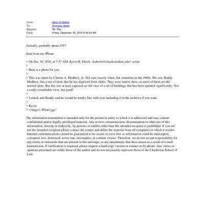 Color photograph (scan) of the view looking west of South Adger's Wharf.
