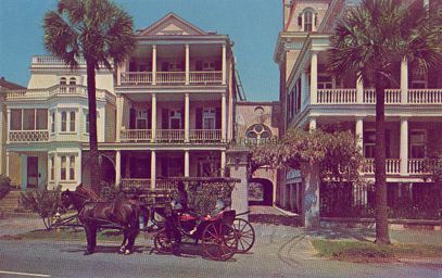 South Battery homes featuring 22 South Battery (Russell Middleton House) and neighboring homes (color photographic print). Horse-drawn carriage on street.Collection