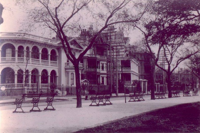 White Park Garden park benches facing South Battery homes (nos. 22, 24, 26). 26 South Battery is prominent (Col. John Algernon Sydney Ashe House).Collection