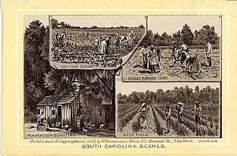 Four images of plantation scenes and field workers: "cotton crop" depicting field-workers picking cotton (inset, top left); "sweet potato crop" depicting field-workers hoeing and laboring, with overseer looking on (top right); "plantation quarters" depicting a wooden cabin with family of workers at home (bottom left); and "rice field" depicting laborers in the field with hoes.Collection
