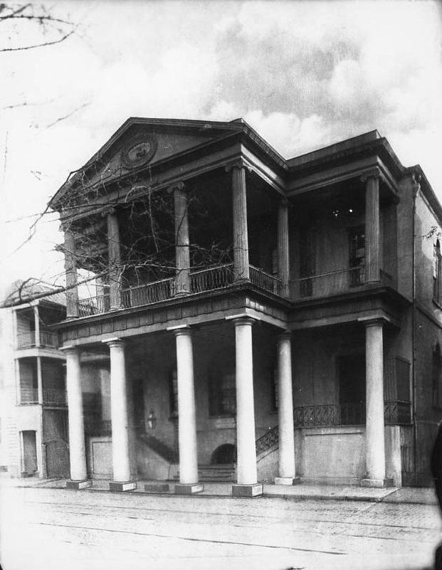 Reprint of a photograph of South Carolina Society Hall (72 Meeting Street), view of the west (front) elevation, taken from across the street. Small portion of the SW corner of 74 Meeting at left. (74 Meeting was demolished by 1944.)