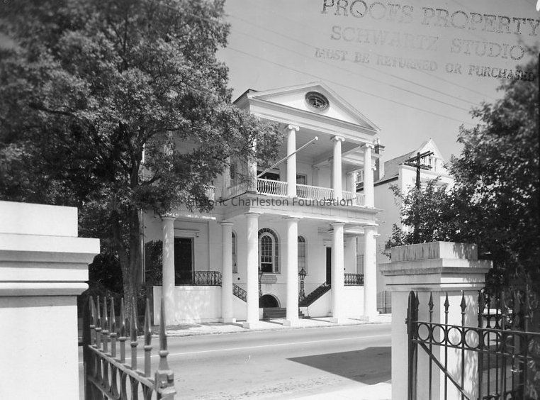 B&W photograph of South Carolina Society Hall (72 Meeting Street), view of the west (front) elevation, taken through the gate of the building from across the street.