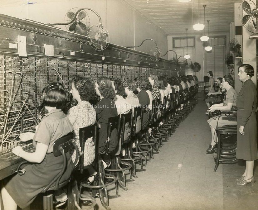 b: Switchboard operators at work, presumably in the building and likely by Howard R. Jacobs.