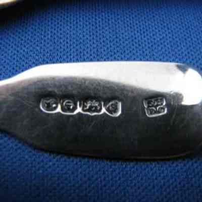 Set of four salt spoons, fiddle-shaped, handle, bat wings above oval bowl, engraved with crest hand holding dagger. Stamped with hallmarks of London, C. 1840-1841, makers mark SH/DC in square cartouche with pinched waist, not identifiedCollection