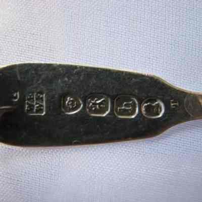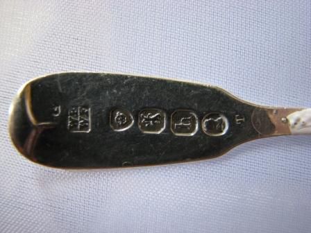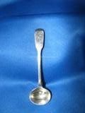 Salt spoon, fiddle shaped handle, oval bowl. Stamped with hallmarks of London, circa 1823-4, makers mark WE/WF, Willliam Ealy and William FearnCollection