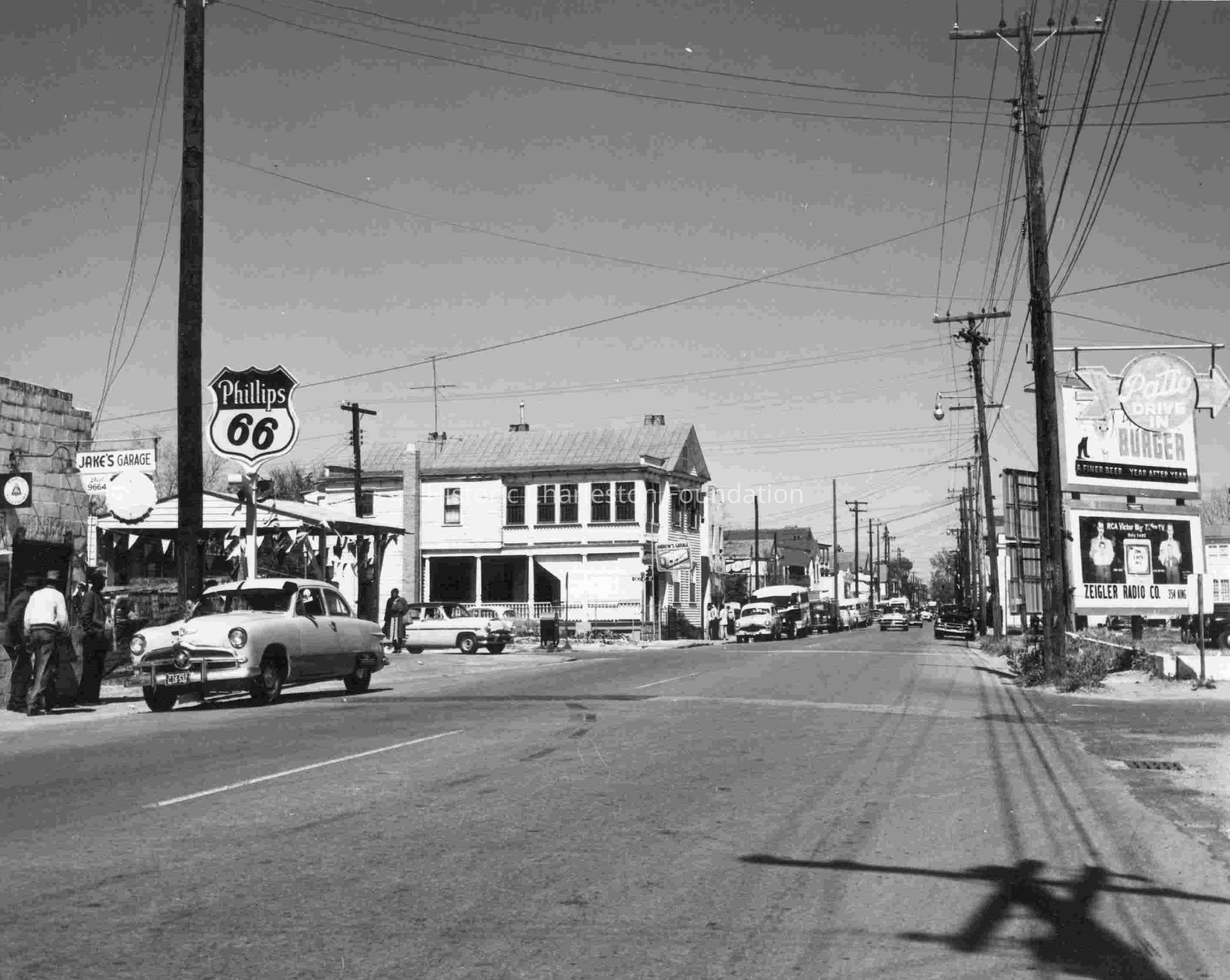 Street scene at Spring Street where Chestnut Street intersects. The area appears to have a mix of commercial and residential buildings. On the left side of the street are a Phillips 66 gas station, Jake's Garage, Andrew's Garage, and a diner with a burger sign out front; also there's a public telephone sign at the far left of the photo. On the right side of the street is a sign for the Patio Drive-In. There are 2 billboards behind the sign, one for "A Finer Beer Year After Year" (brand name obstructed by drive-in sign) and for Zeigler Radio Co. on 254 King Street. Pedestrians on sidewalk and vehicles on the street.Collection