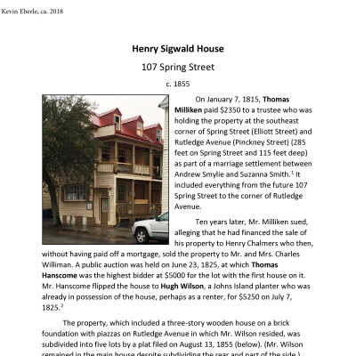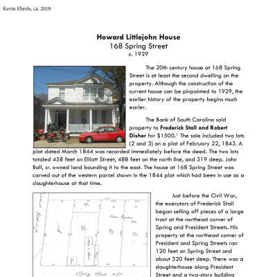 File contains newspaper article about 125 Spring Street; photocopy of brochure for service station at 129 Spring Street, southwest corner of Ashley Avenue and Spring Street (date, source not indicated); photocopies of Spring Street photographic streetscapes and individual buildings,* submitted in support of a BAR application for 106 Spring Street in 2005 (no further information on file); letter to the editor with brief history of 198 Spring Street (with photograph); newspaper article about the James Hotel at the corner of Spring and Hagood Streets, with photograph (1989); newspaper article about gas station to be constructed on site of 127 Spring Street (DYKYC 1936); historical research reports for 107 Spring. 133 Spring (Joseph and Mary Whilden House), and 168 Spring (Kevin Eberle); report "114 Spring Street Briefing Book" describing the project summary, neighborhood, development overview, etc. (JJR Development, 7/23/2019); house history for 48 Spring Street (Lavelle, May 2015); historical research report for 93 Spring Street, the Nagara Engine Co. Firehouse (Eberle, 2021).
