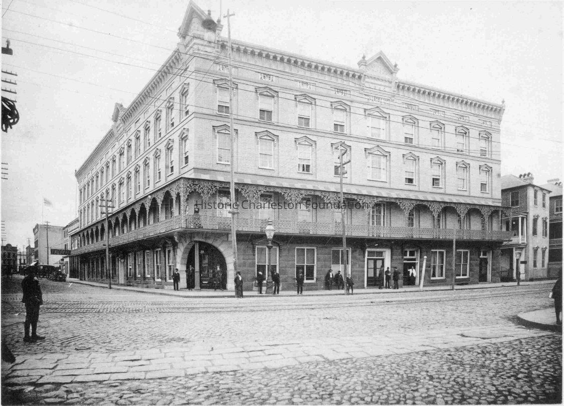 Photograph of the St. Charles Hotel, which had been located at the corner of Meeting and Hasell Streets (237-241 Meeting Street), street elevation, corner view.Context