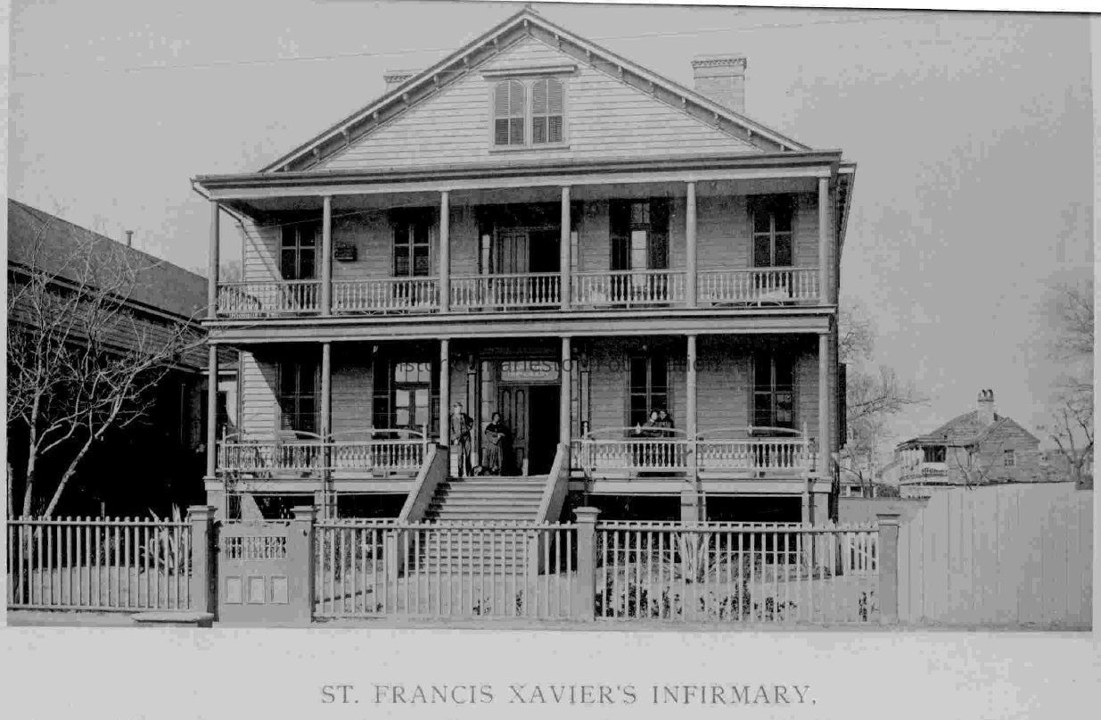 Photograph of St. Francis Xavier Infirmary, which was located near the northwest corner of Calhoun Street and Ashley Avenue (~258 Calhoun Street).Context