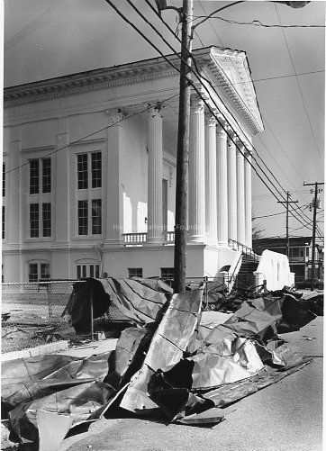 B&W photograph of St. James Methodist Church (68 Spring Street) after Hurricane Hugo. Debris in the foreground. (Karpeles Museum today.)