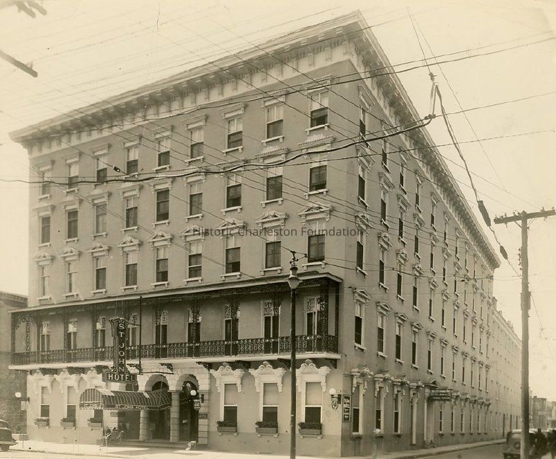 B&W photograph of the St. John Hotel (115 Meeting Street), corner view showing the east (front) and the north (Queen Street) elevations. Sign for the hotel projects from the second floor balcony. Also shows view of the street corner (Meeting and Queen Streets).Collection