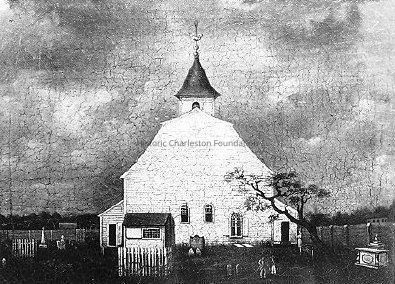 Photographic reprint of an 18th century painting of the original gambrel-roofed wooden building that served as St. John's Lutheran Church (10 Archdale Street).Collection