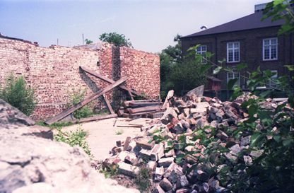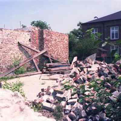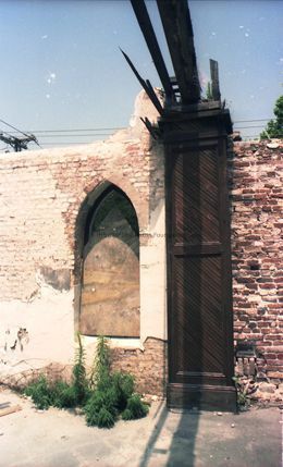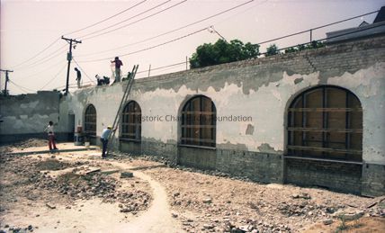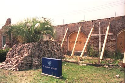 Seven color photographs showing repairs of the original brick walls at St. Luke's Chapel (~171 Ashley Avenue), originally St. Timothy's.Collection