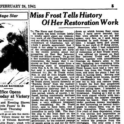 File contains letter to the editor from Susan Pringle Frost that refers to her restoration efforts on St. Michael's Alley ("Miss Frost Tells History of her Restoration Work," 2/24/1941); historical research notes regarding various St. Michael's Alley buildings; photocopy of photograph of a "quaint row of houses" (undated, unattributed); newspaper article (1957) "Picturesque Alley Makes Comeback"; photograph of 18th c. plat showing St. Michael's Alley and the St. Michael's Church churchyard (similar plat on ROD website).Collection