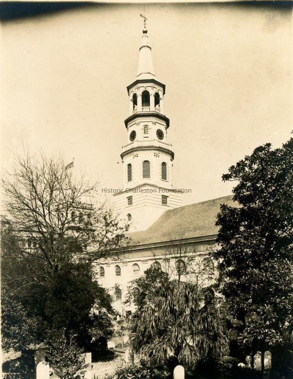 Photograph of St. Michael's Church (80 Meeting Street), viewed from across the graveyard. Top of the U.S. Post Office in background.Collection