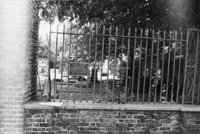 B&W photograph of the St. Peters Church Graveyard iron fence with plaque mounted at left. Photographed as part of "Historic Charleston Foundation's Endangered Structures Report" (see P156).Collection