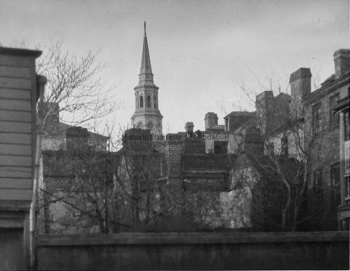 B&W photograph of the steeple of St. Philip's Church from Chalmers Street.Photograph Details
