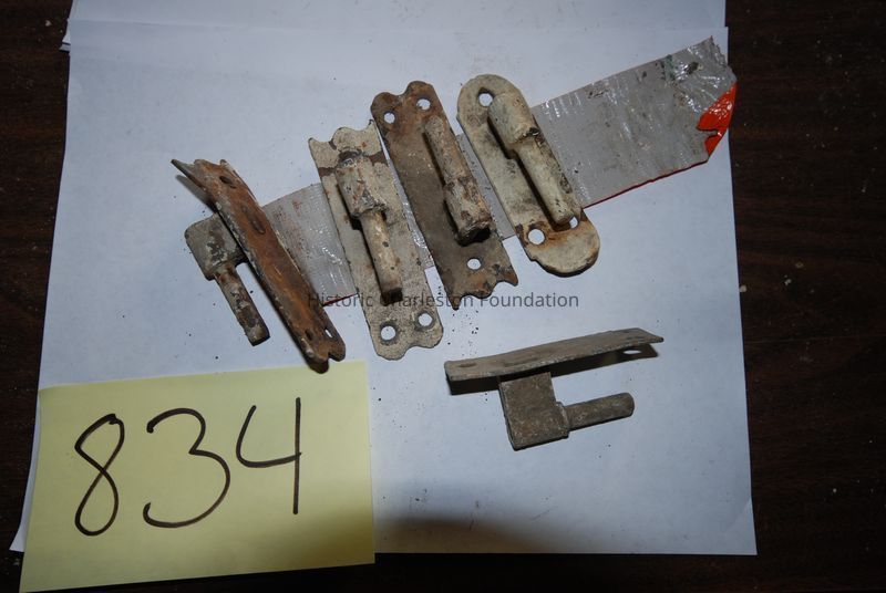 Four stamped steel pintle hinges from a group of five. For shutter straps.