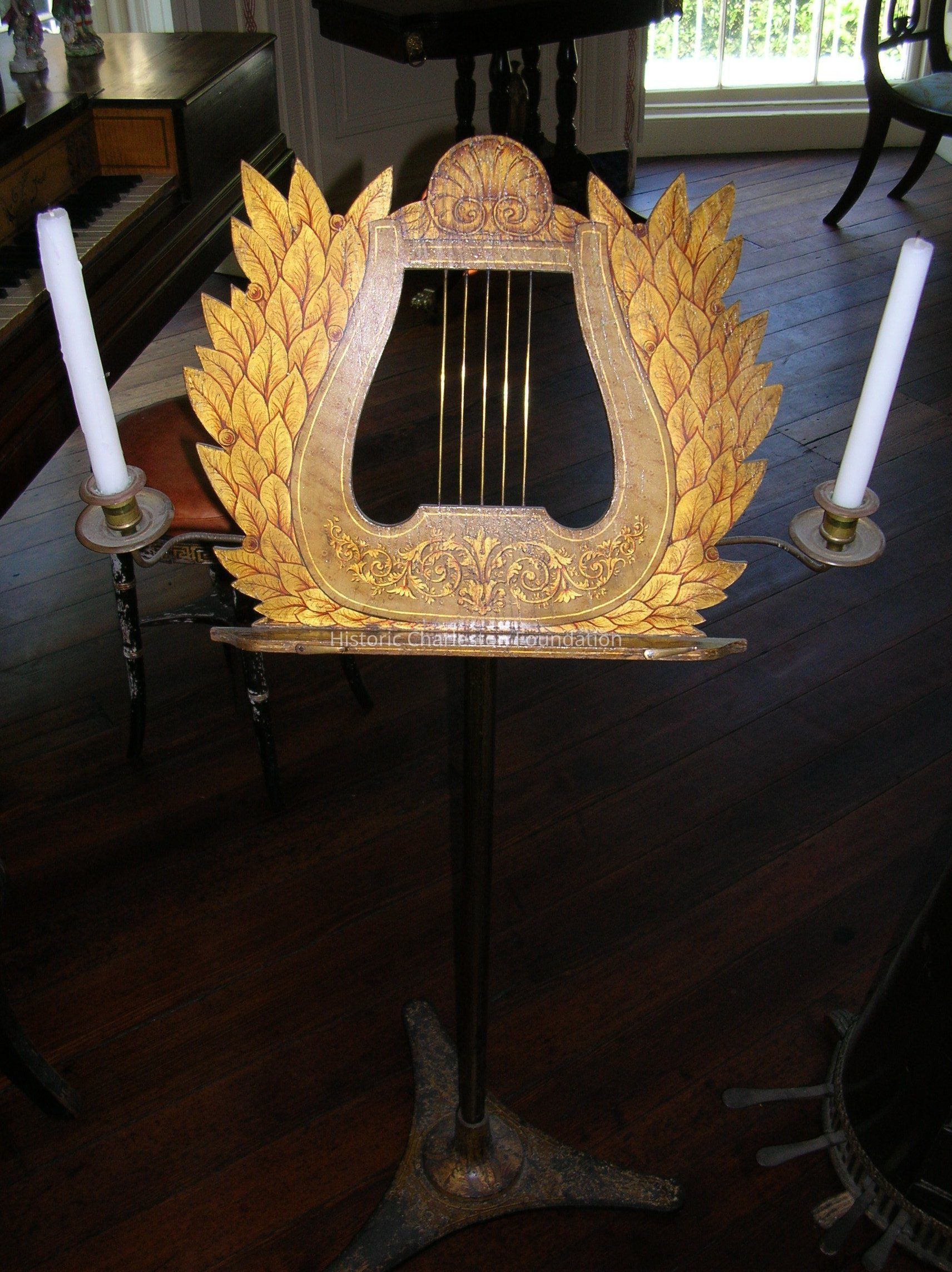Regency Music Stand, Wood and Metal, on Adjustable Metal Pole on Painted Three Sided Metal Base. Music Resto of Painted Wood in Shape of a Lyre with Painted Leaf Decoration. Center of Rest Is Cut Our with Five Metal Poles in Imitation of Strings. Two Gilded Metal Candle Arms At Each Side with Round Bobeches, Shafts and Drip PansCollection