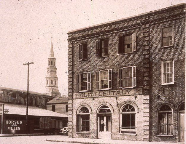 b: Features a view looking southeast from the three-story brick building with a sign for "Little Italy Inn" (55 State Street). Across the street on Cumberland Street is a one-story stable building with "Horses and Mules" painted on the front of the building and a round sign for "Red Stables" projecting from the corner of the building. St. Philip's Church steeple in background.