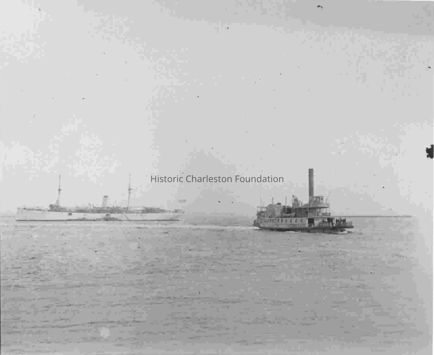 Identified as the steamboat ferry Sappho which carried passengers and goods between the Custom House Dock and Mt. Pleasant. The ship "Prairie" is in the background. Originally identified as US ship "Prairie" and steamboat "Sappho" about 1910.Collection