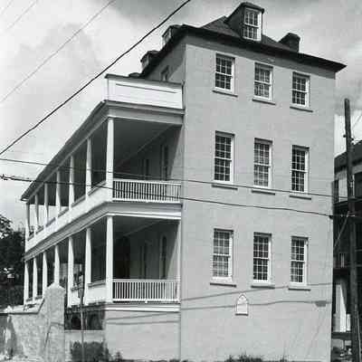 b: East Bay Street (east) elevation. Also shows the piazzas. Sign posted on facade: "Stephen Shrewsbury House Built Before 1809 Restored by Historic Charleston Foundation."Collection