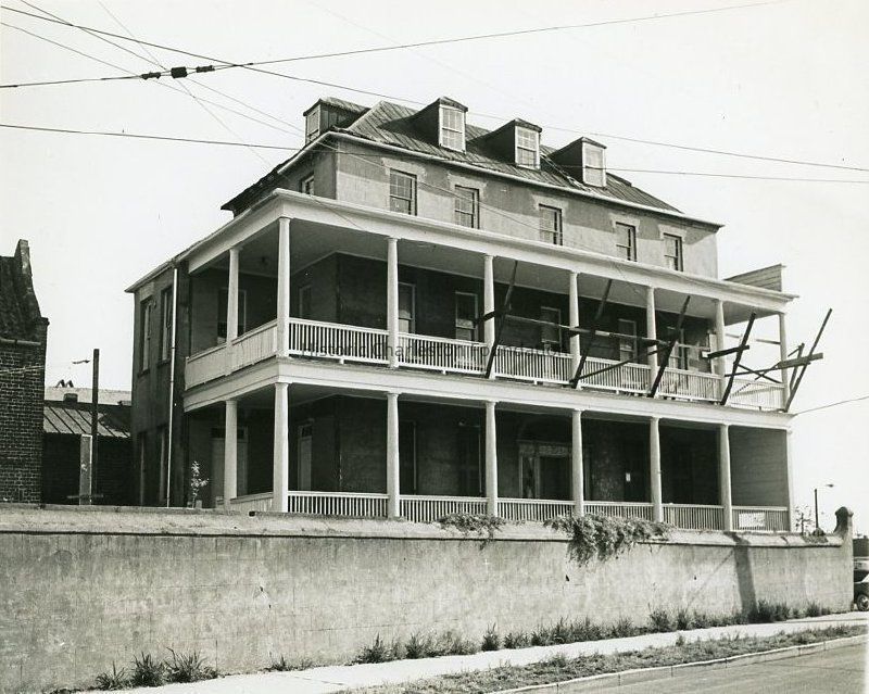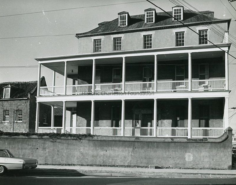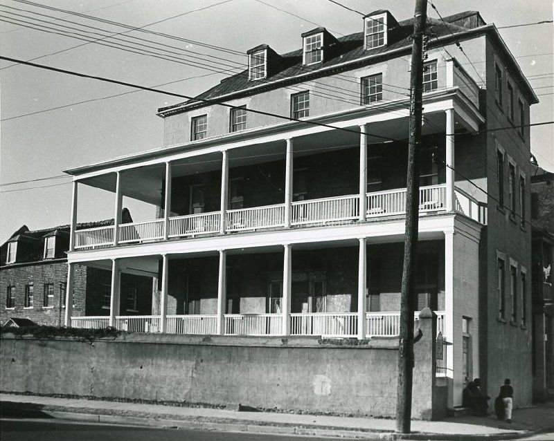 Laurens Street (south) elevation showing the piazzas. Also shows the kitchen dependency (at right) and the street corner (East Bay and Laurens Streets). Captioned on back of photo: "311 East Bay St. exterior south unrestored."