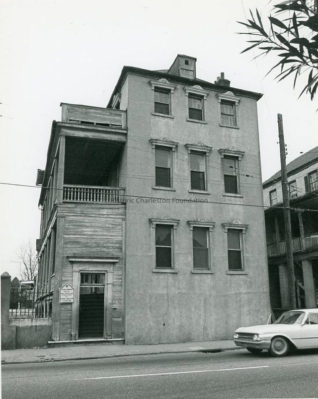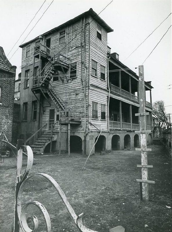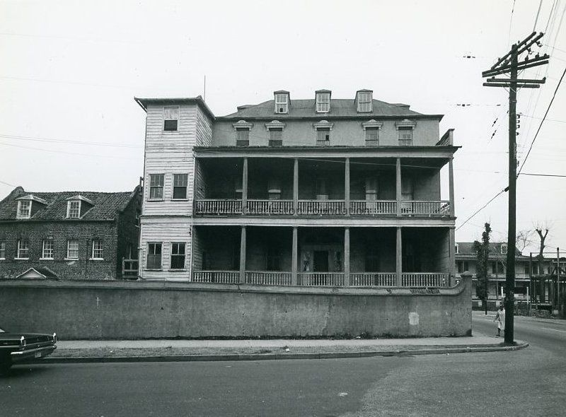 a: Laurens Street (south) elevation showing the piazzas. Also shows the kitchen dependency (at left) and the street corner (East Bay and Laurens Streets). Captioned on back of photo: "Exterior south unrestored."
