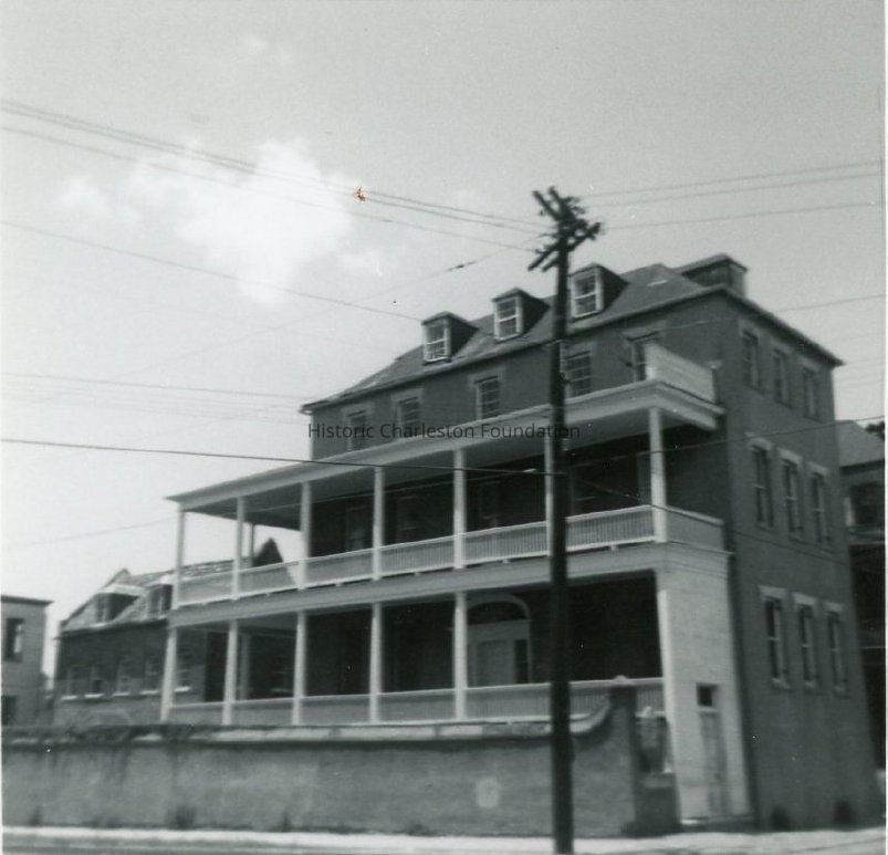 B&W photograph of the Stephen Shrewsbury House (311 East Bay Street) before rehabilitation by Historic Charleston Foundation. Shows the south (piazzas) and east (front) elevations. Also shows the street corner (East Bay and Laurens Streets).Collection