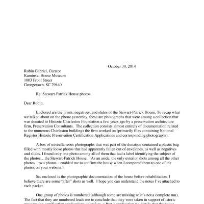 This collection consists of scans of photographs, negatives, and slides that were originally given to the organization that managed the Stewart-Parker House by HCF's Archives years before HCF acquired an easement on the property. After the easement was obtained, Archivist requested the scans of the photographs made by the Georgetown County Library's Digital Library staff. They were provided to HCF in 2016, although it is uncertain whether all photos were scanned.Created By