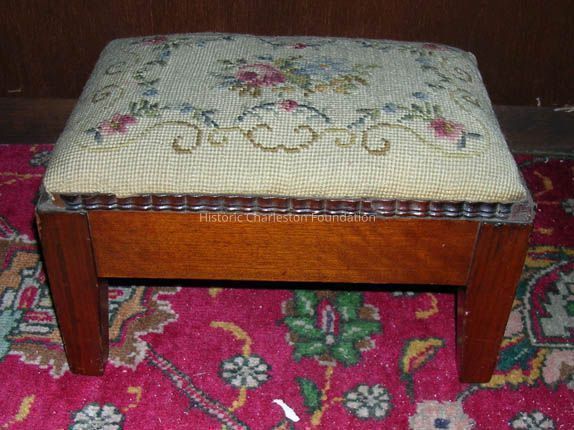 Footstool, Mid-19th century, having rectangular top upholstered in needlepoint with beige ground; raised on slightly tapered legs.Acquisition
