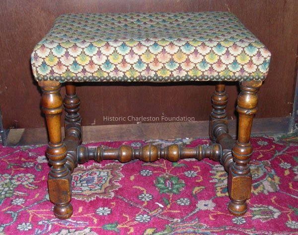 Foot stool, early 20th century, after the Jocobean style, having rectangular top covered tapestry having scalloped pattern with brown ground decorated with beige/brown, yellow/green, light/dark blue cololr pattern, on turned and block legs on ball feet, joined with 'H'-shaped stretcher.Collection