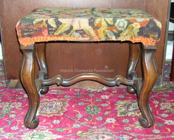 Stool. after the antique, walnut having rectangular top upholstered in chenille tapestry over cabriole legs, on modified claw-and-ball foot, having shaped stretcher support.Collection