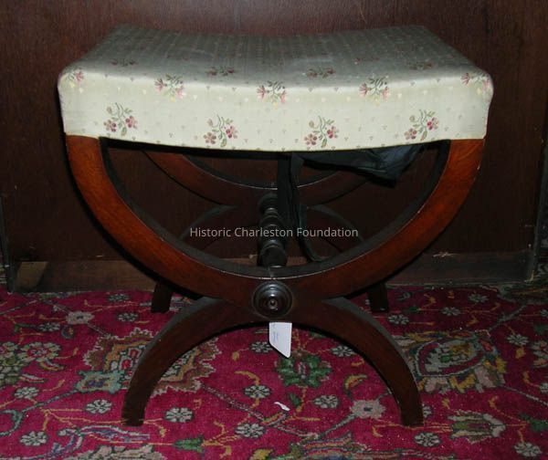 Stool, after the antique, mahogany, having rectangular and molded seat, upholstered in beige floral material, on currule legs decorated with roundel at center.Collection