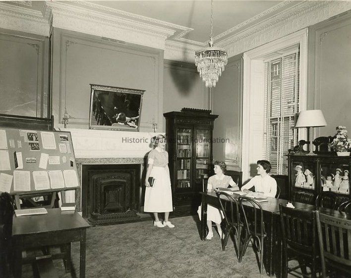 B&W photograph of an interior room of the Kinloch Home for Nurses (Jonathan Lucas House) where three nursing students are studying.