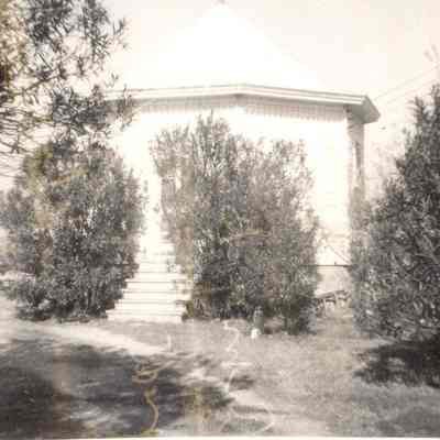 Photo B: Identified as Back Road, Station 15, Army bandstand made into little house, blue blinds(?).