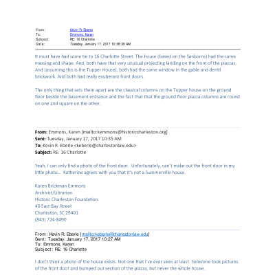 While "Sommerville, S.C., Mrs. Woodruff's" is handwritten on back, HCF staff agree that it isn't a house in Summerville. Building was identified by Kevin Eberle as 24 Ann Street (Tupper House) but other photos of the ground entry of the house do not match.Created By