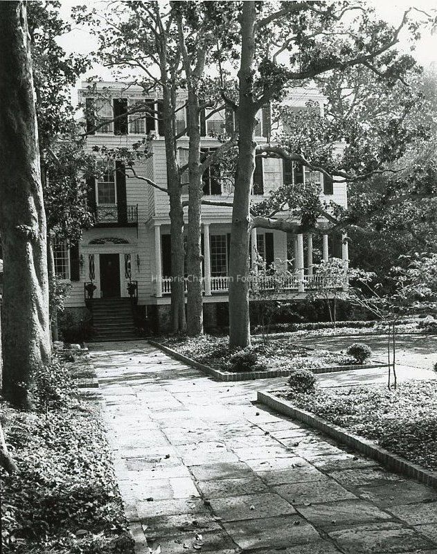 B&W photograph of the Sword Gate House (32 Legare Street), east (front) elevation, viewed from across the front garden.Collection