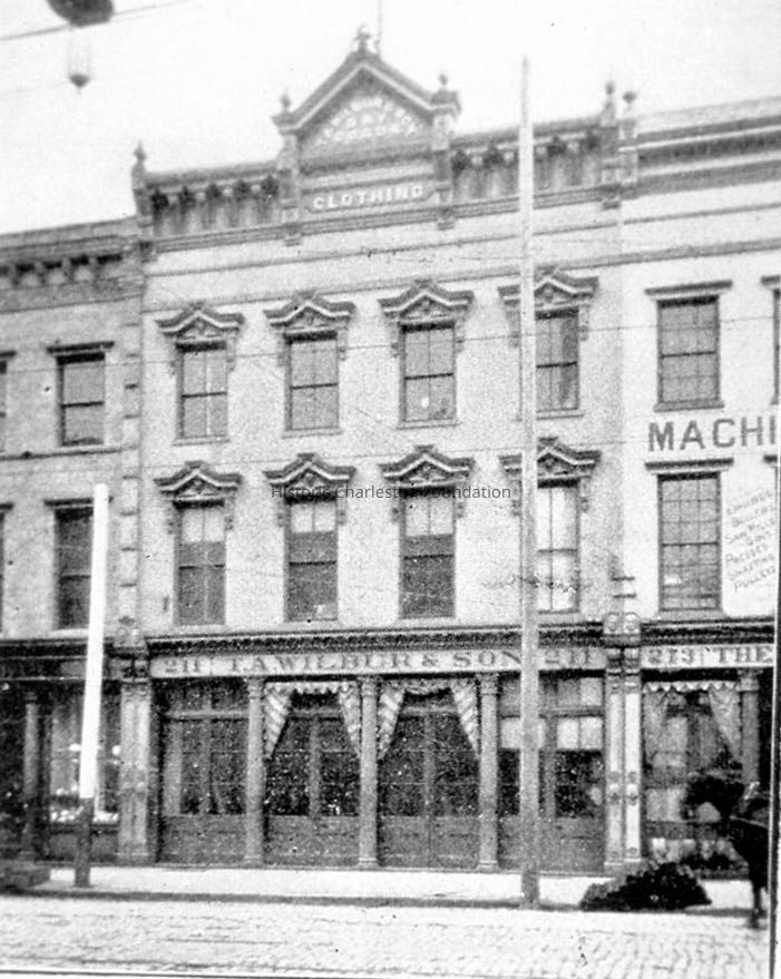 Photograph of a photo illustrating the descripbion of T.A. Wilbur & Son, Clothing, Dry Goods, etc., from "The Resources & Attractions of Charleston." Features the the front (east) facade of the building (211 Meeting Street).Collection