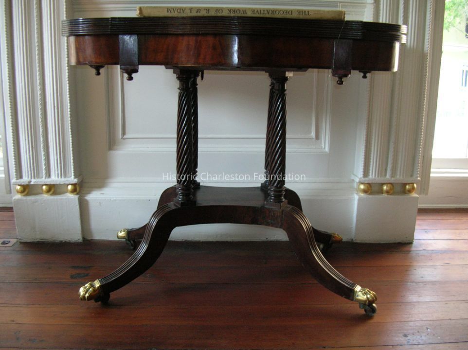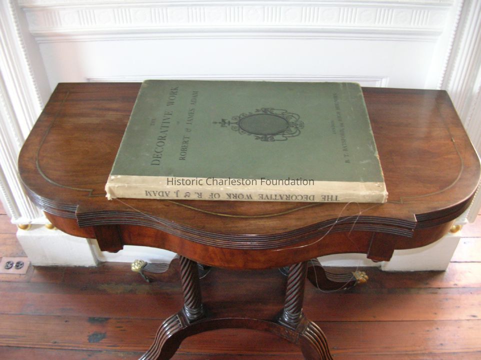 Mahogany Card Table with Hinged Back. Edges of Table Are Reeded and Table Top Has Metal Inlay in Plain Band. Four Small Ball Pendants Attached To Apron. Central Support Is Formed of Four Turned Legs Resting on Square Platform From Which Four Curved, Reeded Legs with Brass Paw Feet with Casters Extend.Collection