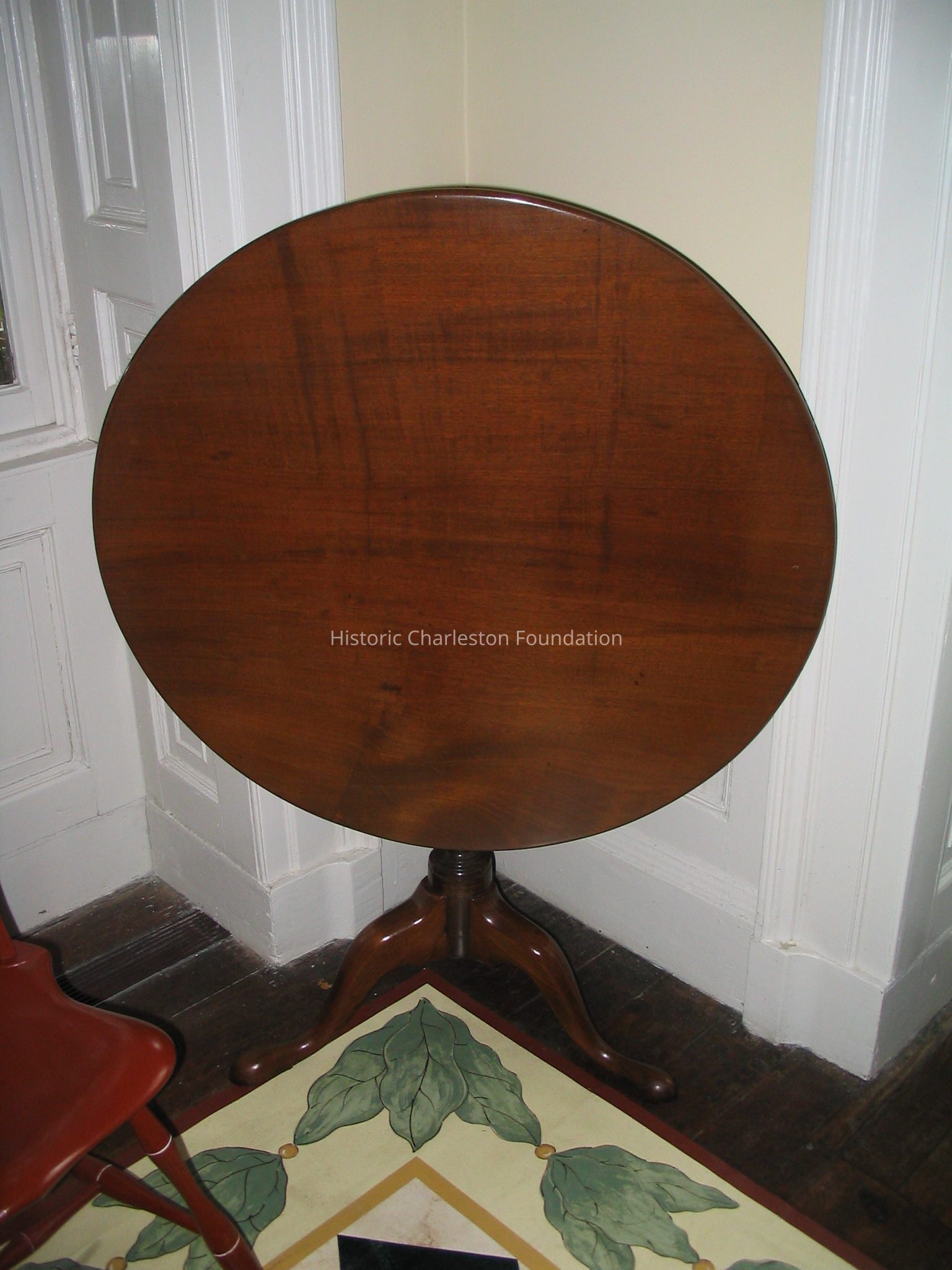 Notes: John Bivins : The tea table in Maryland is entirely mahogany, and I would say dates 1760-1770. The Pedestal turning is one of about two dozen that I consider to be by the same Charleston turner. The rest of the table was made in one of the shops of which we have at least five complete tables, based upon the leg patterns; a virtually identical one is illustrated in fig. 130 of Milby. Typical of most Charleston tables, this one does not have a "birdcage," that is, a turning top. It is good to excellent condition, and really needs nothing except rubbing up and the removal of some old plastic wood under the pedestal.. The two replaced legs scarcely can be differentiated from the original, which is why I studied them very closely and discovered from their surfaces that they were early replacements. Elfe, as mentioned, recorded numerous tea table repairs, the most monumental of which was " to a new Pillar for a Tea Table" at L 2:1 in 1772. It was probably broken at the bottom where the legs dovetail in place. I think an untouched one would bring $20,000.