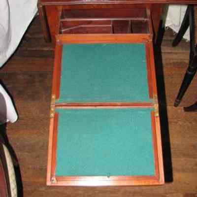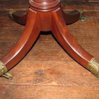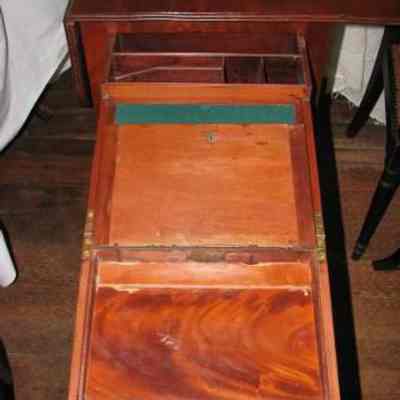 Writing Table, New York, c. 1810-1820, mahogany: rectangular top with two hinged drop leaves above writing slide fitted with baize cover, above two short drawers, body having four turned dropped finals over carved urn-shaped column, on shaped legs fitted with brass paw feet and castersCollection